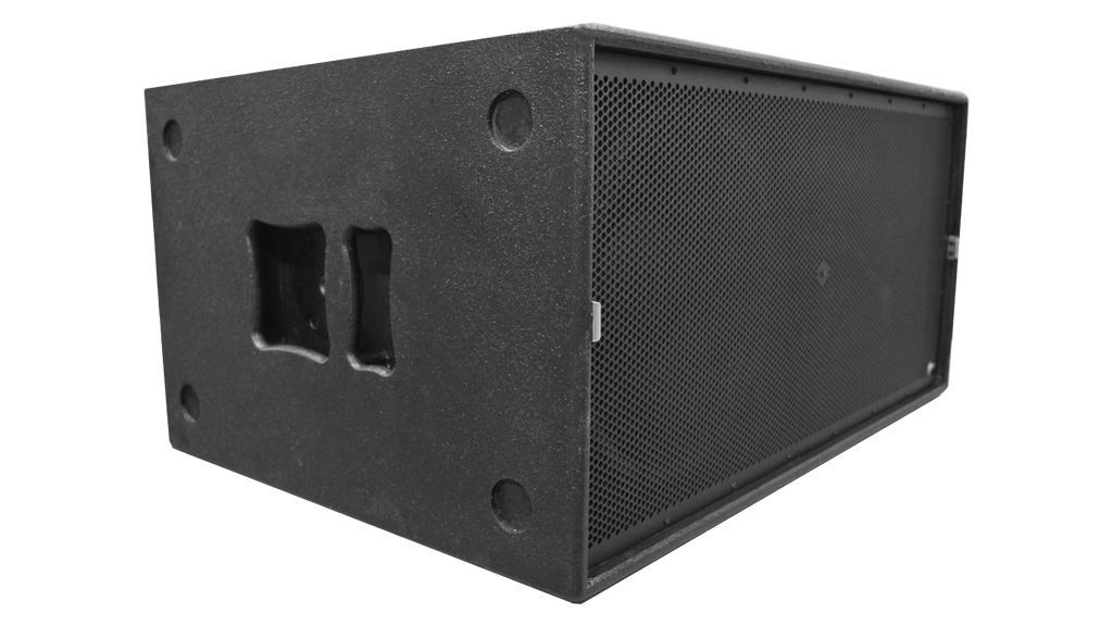Caisson de sub "low profile" double 8", avec un SPLmax de 126 dB. Hmax = 240 mm.